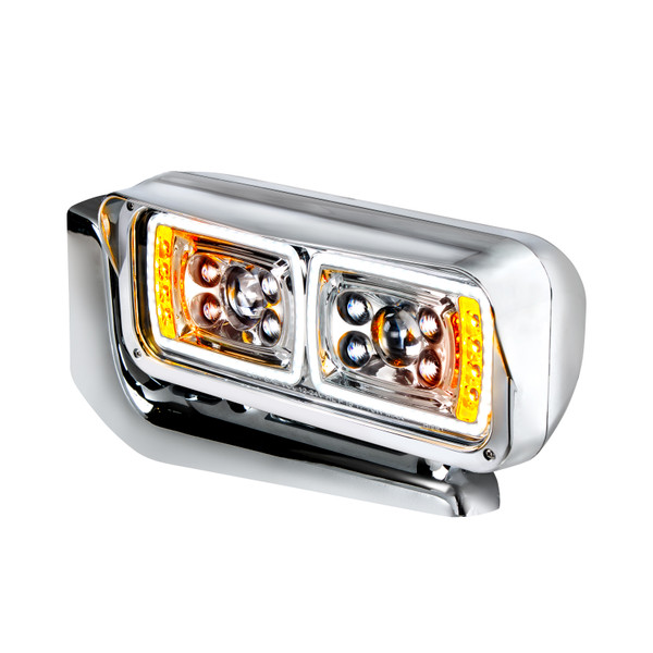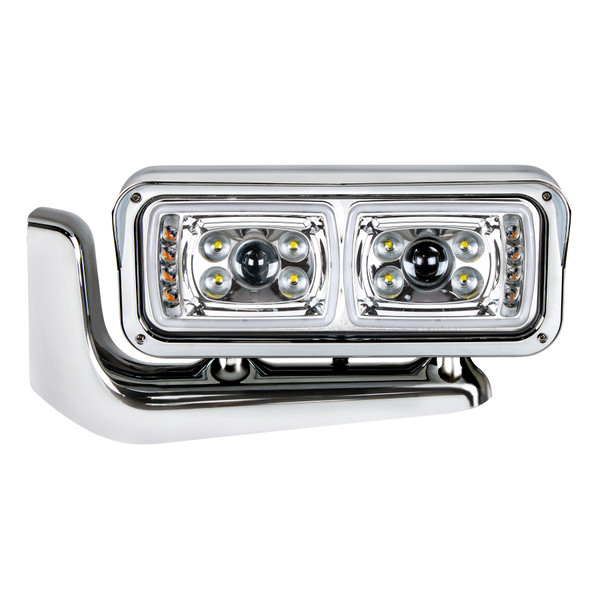 All LED dual function headlight assembly with chrome plastic housing and die-cast mounting arm. Direct replacement for Peterbilt 379, other models such as 357/359/365/367/378/389/567 will require...