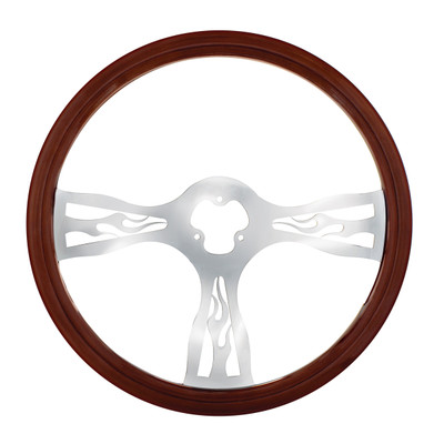 18" wood rim steering wheel with chrome spoke. 3 spoke "flame" steering wheel. Steering wheel only. Hub and horn available separately. Mix and match with united pacific hub and designer horn bezel...