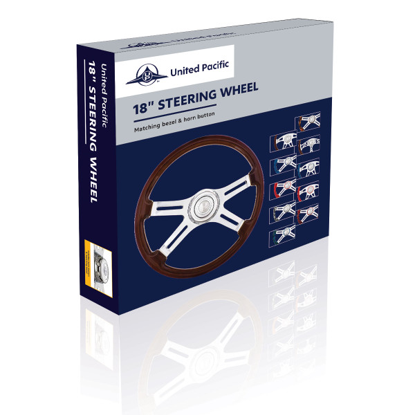 Polished wood rim with chrome horn bezel and horn button. 18" diameter with comfortable finger grips on back edge of rim. Fits all commercial 3 bolt hubs, sold separately.