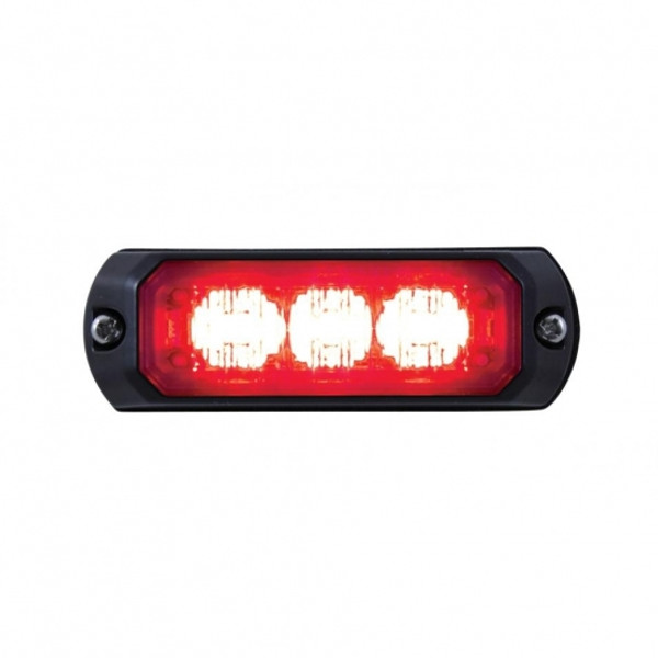 3 high power LED warning light with black bezel. 12-24V DC application, surface mount, 12 flash pattern, multiple light synchronization. Mounting holes are 3 1/4" apart. Available in white LED.