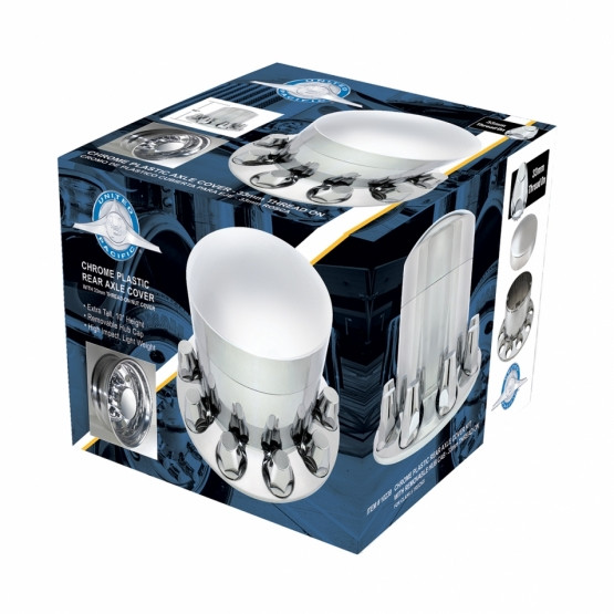 Beautiful chrome plated finish with triple chrome plating process. Chrome plastic spike rear axle cover with removable cap. Universal fit, fits most 11-1/4" and bolt circle/center applications...