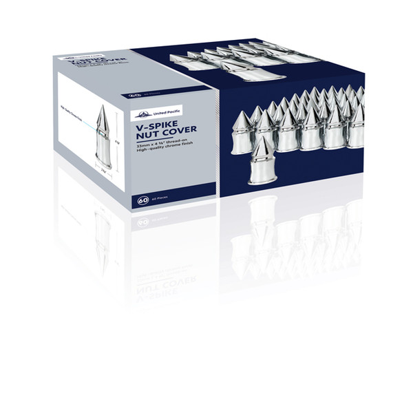 Chrome plastic 33mm push-on v-spike nut cover. Beautiful high quality chrome plated finish with triple chrome plating process. Fits over standard 33mm lug nuts on hub piloted wheels. Designed to...