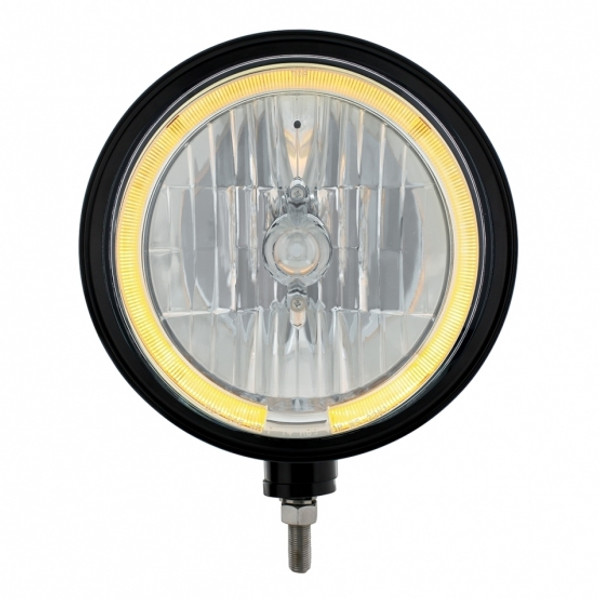 Black "Billet" Style Groove Headlight With Visor 9007 Bulb With Amber LED Halo Rim
