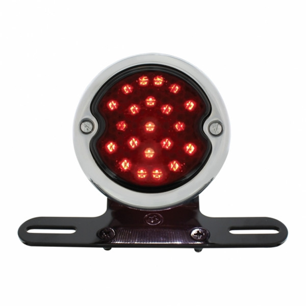 Bobber style LED 1933-36 Ford LED tail light with smoke lens and LED license light. Beautiful chrome plated license plate mounting bracket. Perfect for custom motorcycles.