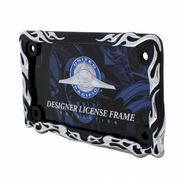 Chrome plated frame with flame design. Fits all U.S. motorcycle license plates.