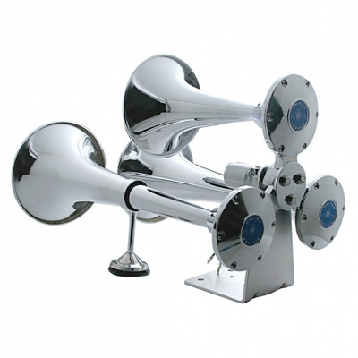 Chrome 3 trumpet classic train horn with trumpet support bracket. Sound output: 145db +/-10db, 12V heavy duty electric solenoid included.