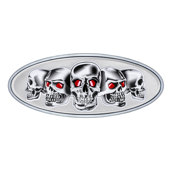 Beautiful high quality chrome plated finish with triple chrome plating process. Sold each. Die cast oval emblem with red outer accent and red eye socket. 7-7/8 X 3-1/4", aluminum decal. Mounting...