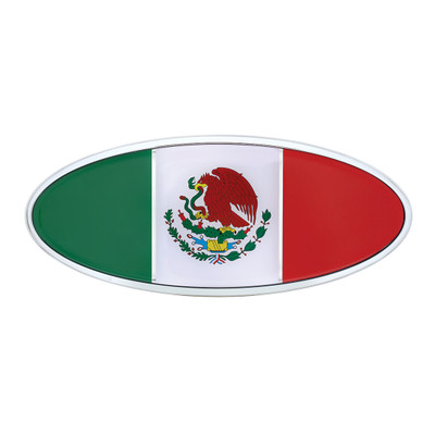 Die-cast metal oval emblem with beautiful chrome plated finish. 7-7/8" X 3-1/4" with mounting studs 6-1/4" apart. Pressure sensitive adhesive tape and speed nuts included. Dress up any vehicle.