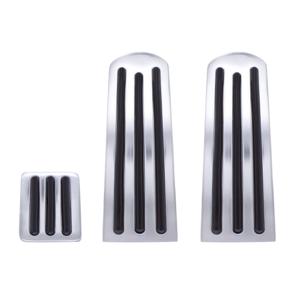 Aluminum foot pedal set for Peterbilt. Includes gas, brake and clutch pedals. Available with black rubber insert.