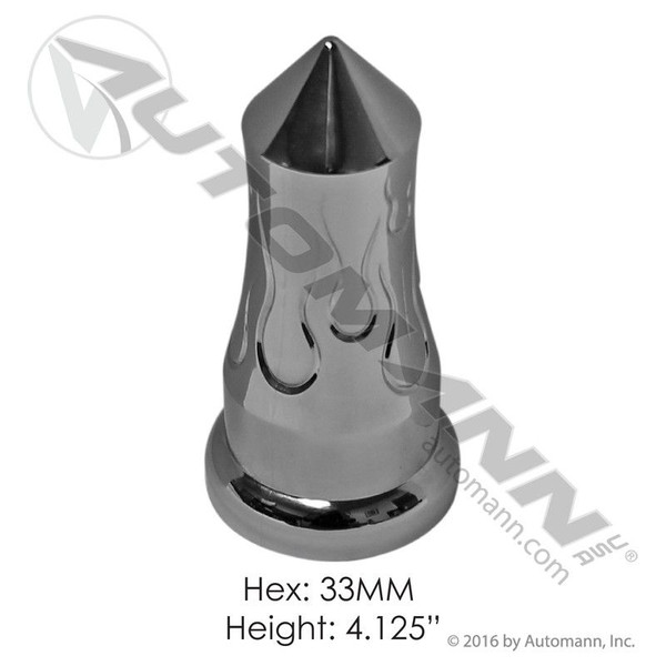 - Lug Nut Cover, Chrome Plastic Push On 33mm x 4-1/8in Flame Design Spike