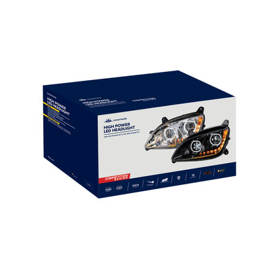 All LED 12-24 volt headlight assembly for Peterbilt 579/587 trucks. 9 LED amber turn signal with sequential operation. 100 LED white halo position lights. 9 LED amber side marker light with P2 rating...