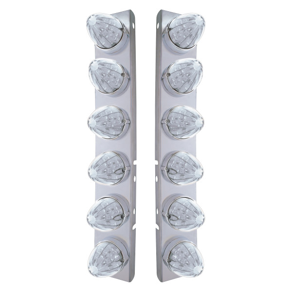 Stainless steel Peterbilt front air cleaner bracket with twelve 19 LED lights. Highly polished 304 stainless steel finish for durability and shine. 19 LED w/ amber lens watermelon style item # 38313b...
