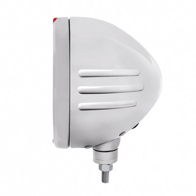 Highly polished 304 stainless steel headlight housing with embossed stripes on the side. Fully assembled with crystal halogen headlight bulb. Headlight bulb features 34 white LED accent lights...