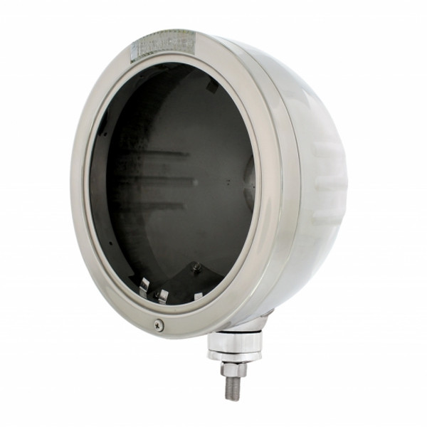 Highly polished 304 stainless steel headlight housing with embossed stripes on the side. Fully assembled with H6024 halogen bulb, item # 30356. Includes polished stainless steel "Bullet" style...